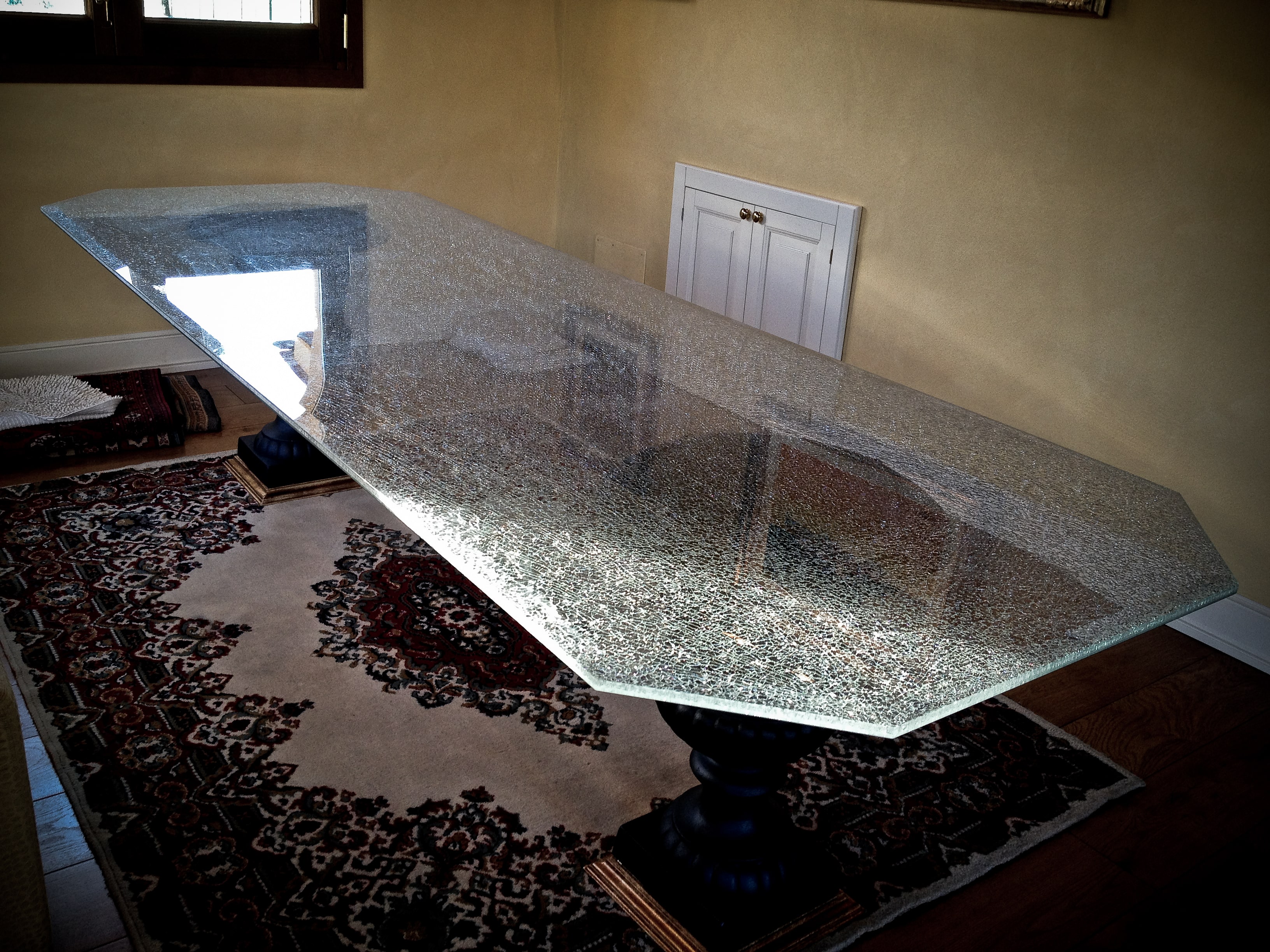 Immaginate in casa vostra un intero divisorio in vetro cracklè, con illuminazione annessa, o di far cenare i vostri ospiti in un tavolo con questo tipo di vetro, rimarrete senza parole voi ed i vostri ospiti, garantito!